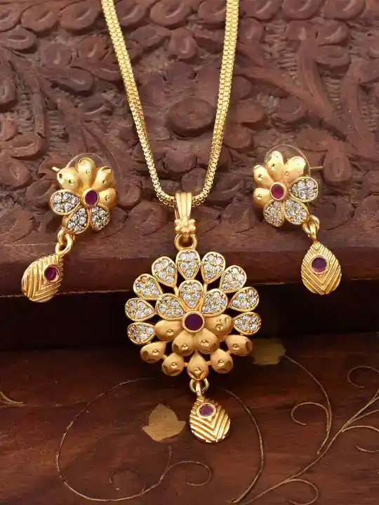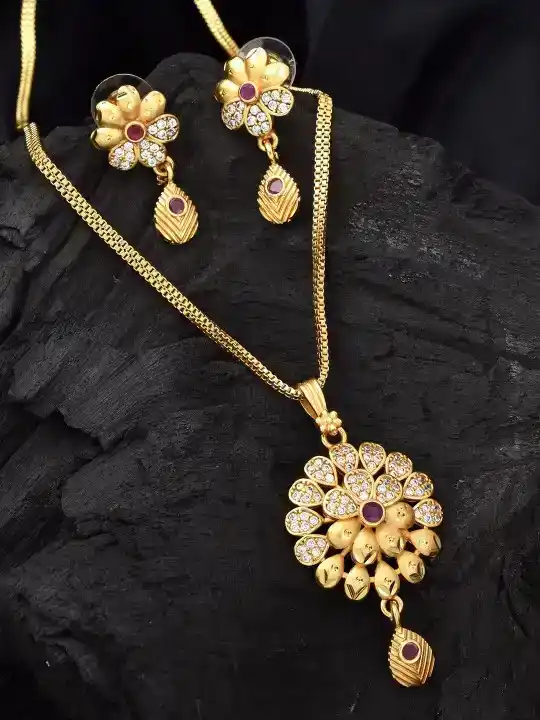 Gold-Plated Cubic Zirconia-Studded fancy flower pendent Set