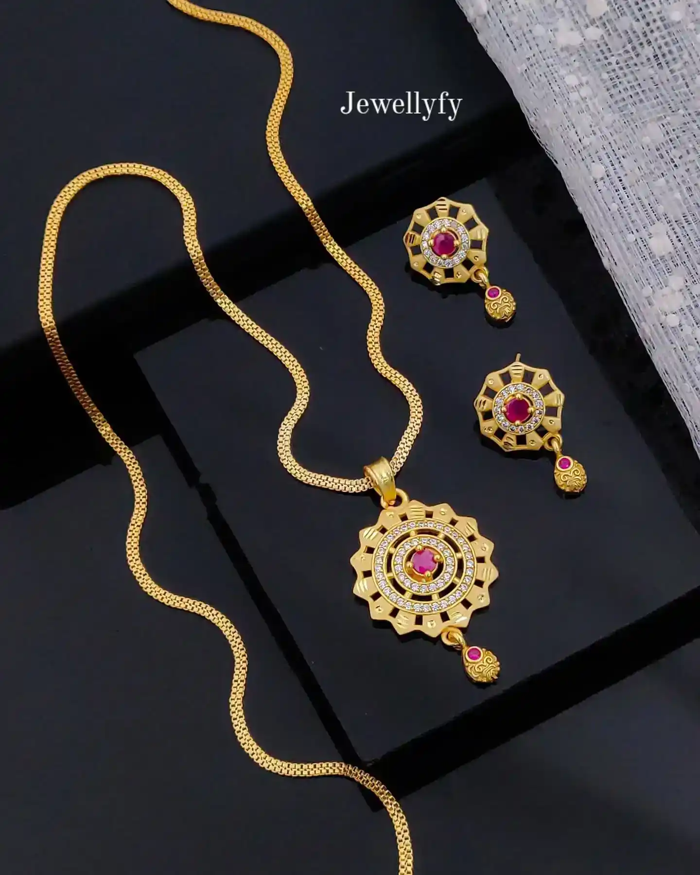 Gold Plated Ruby and Diamond Studded Fancy Flower Pendent Set